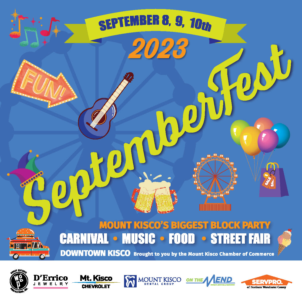 DESCRIPTION:A monster weekend\, with three days of family fun!The Mount Kisco Chamber of Commerce\, in conjunction with the Village of Mount Kisco\, presents SeptemberFest 2023! Join us\, on September 8th\, 9th and 10th. Full-size Carnival\, Food & Beer\, Music\, Street Fair (Saturday)\, Art Show (Sunday) and more! SEPTEMBERFEST HOURS FRIDAY\, SEPTEMBER 8TH / 5PM-11PMSATURDAY\, SEPTEMBER 9TH / 10AM-11PMSUNDAY\, SEPTEMBER 10TH / 12PM-8PM(Full Schedule of Activities is on the Home Page of this Website)